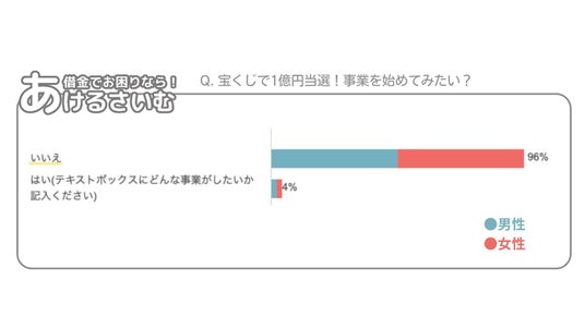 「宝くじで1億円当たったら、事業を始めたい!」と回答したのは全体のわずか4%となりました。どんな事業を始めたいかという質問に対しては以下の回答があがりました。