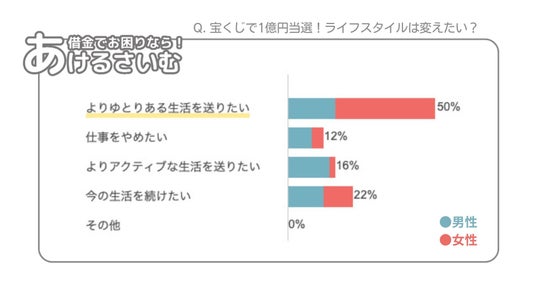 この質問は、宝くじで1億円当たった場合のライフスタイルの変化に関する意向を調査したものです。最も多かった回答は「よりゆとりある生活を送りたい」で、全体の50%を占めました。これは、経済的な不安から解放され、心のゆとりを取り戻したいという、多くの人々の共通の願いを表していると考えられます。