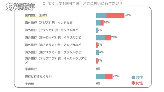 宝くじが当たったらどこに旅行に行きたい?という質問に対して、最多回答となったのは「国内旅行」38%でした。