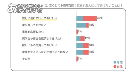 宝くじで1億円当選した際に、家族や友人にしてあげたいことは?という質問に対して最も多かったのが「旅行」で全体の30%を占めました。