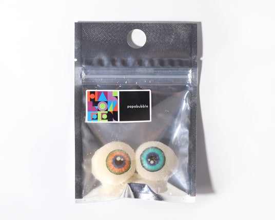 目つぶしもできちゃいそうな!? カラフルな眼球のバブレッツです。ホワイトソーダの目玉グミが2個入っており、オッドアイの瞳は、オリジナルのモンスターアイテムを作ることができるパーツとしてもおすすめです。他の食べ物にくっつけてパーティーを盛り上げることもできる、パパブブレならではの商品です。