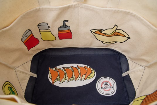 トートバッグの表には小さい餃子の刺繍。内装には餃子定食のイラストを大きくプリント。「秘めた餃子愛」がテーマです。