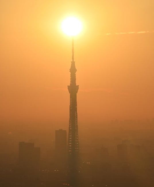 東京スカイツリー(R)と太陽が近づく時間:6時35分頃