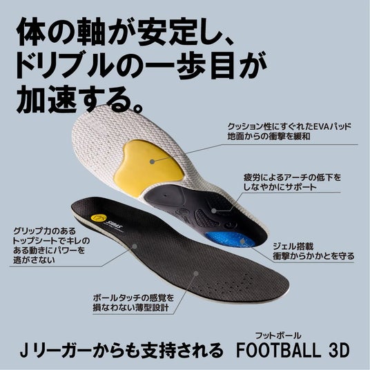 成長期のジュニア世代だけでなく、大人のプレーヤーにも支持されているのが、SIDASのサッカー専用インソール「フットボール3D」。衝撃吸収性と安定性に優れた立体構造が、プレー中の足のブレを抑え、パフォーマンス向上を実現。今回発売の「マックスプロテクト・フットボールジュニア」と同様に、サッカーに特化した機能を備えており、親子でインソールによる足元ケアを取り入れることが可能です。