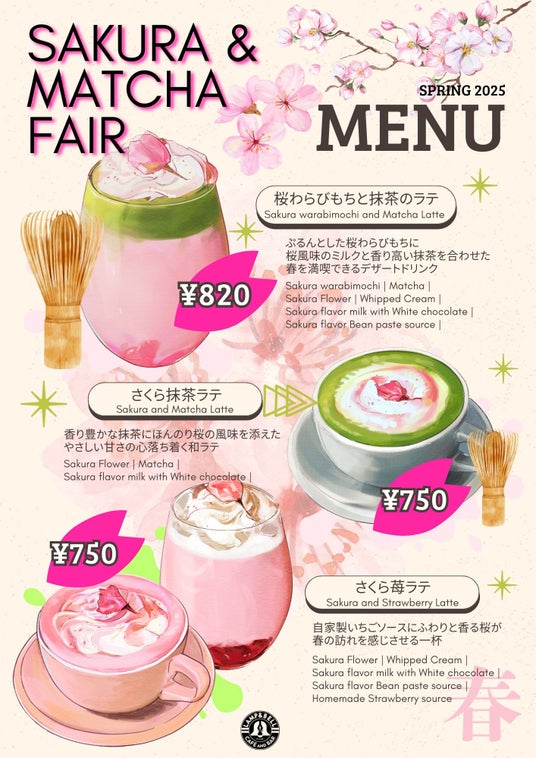 ぷるんとした桜わらびもちに桜風味のミルクと香り高い抹茶を合わせた春を満喫できるデザートドリンク。和の味わいとふんわり桜の香りが、口いっぱいに春を運んできます。