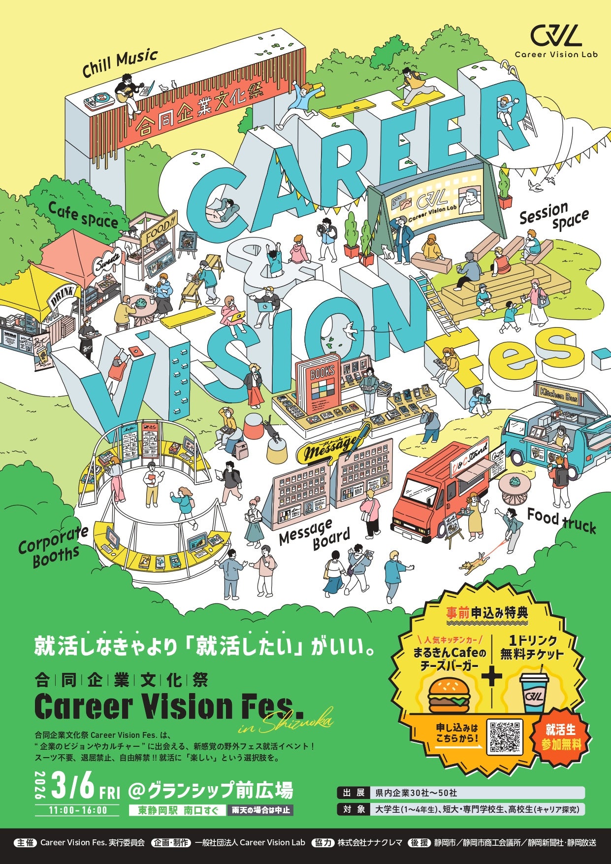 静岡市が後援する、学生向けキャリアイベント「合同企業文化祭~Career Vision Fes in Shizuoka」が、2026年3月6日(金)にグランシップ芝生広場で開催されます。