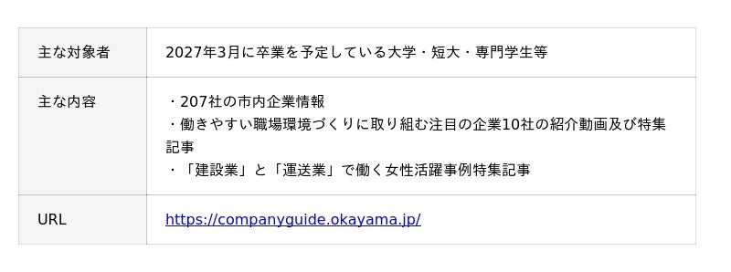 そして、この度、2027年3月学卒者向けに、市内企業207社の情報を集めた「OKAYAMA COMPANY GUIDE 2027」の冊子の作成及びWEBサイトの更新をしました。特集として、働きやすい職場環境づくりに取り組む注目の企業10社の優れた事例や「建設業」と「運送業」に限定した女性の活躍事例についても詳しく紹介しています。