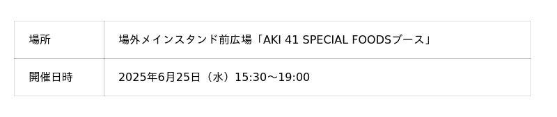 当日は、場外メインスタンド前広場にて、家長選手の招待企画「AKI41 SPECIAL SEAT with infomart」から発展した、子ども向けイベント「AKI 41 SPECIAL FOODS」を実施します。