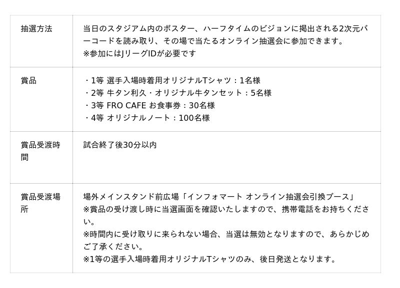 選手入場時着用オリジナルTシャツや川崎フロンターレのクラブパートナーでもあり、当社のユーザーでもある株式会社利久様の「牛タンセット」等が当たるオンライン抽選会を開催します。