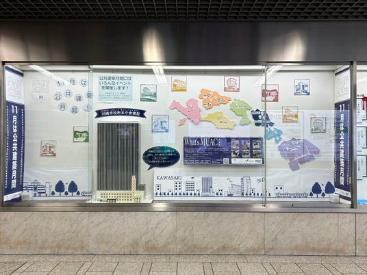 MUAC(ミュアック)は、これらの実施に先立ち、川崎市役所本庁舎の1/100の模型や川崎市の地図などのボードを作成し、川崎駅前の地下街・川崎アゼリアで2024年8月30日~9月13日の2週間、ウインドウディスプレイ展示を行いました。また、Instagramアカウント(@we_are_muac)を立ち上げイベント開催の周知を進めています。