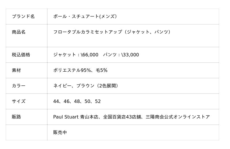 三陽商会が展開するブランド「Paul Stuart(ポール・スチュアート)」メンズは、糸と織りの両面から軽さと涼しさを追求した『フロータブルカラミ』セットアップ(ジャケットとパンツの2型)を「ポール・スチュアート」メンズを展開する全国百貨店、直営店の計44店舗と、三陽商会公式オンラインストア「SANYO ONLINE STORE(サンヨー オンラインストア)」にて4月1日より販売を開始いたします。