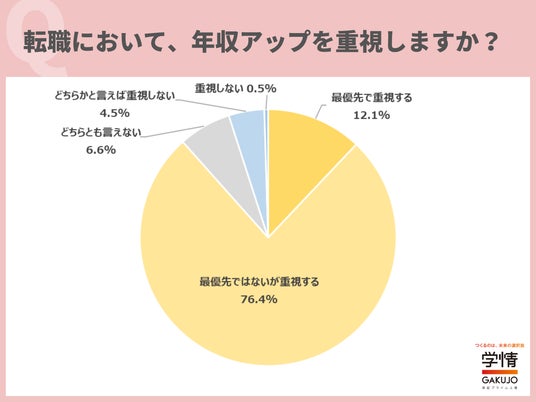 株式会社学情(本社:東京都中央区)は、20代の仕事観や働く意識をひも解くために、アンケート調査を実施しました。今回は、「年収アップ」に関して調査。転職において、「年収アップ」を「最優先で重視する」と回答した20代が12.1%に上りました。「最優先ではないが重視する」を合わせると、約9割の20代が、転職において年収アップを重視するとしています。「年収は上げたいものの、仕事内容を最優先に考えている」「残業時間や年間休日数など、働き方と年収のバランスを見て転職先を決めたい」などの声が上がりました。また、年収の高い企業は「志望度が上がる」と回答した20代が約9割に上りました。「年収が高い企業は魅力を感じる」といった声の他、「年収は上げたいものの、企業が求めていることに、自分が対応できるかは見極めたい」といった声が寄せられています。