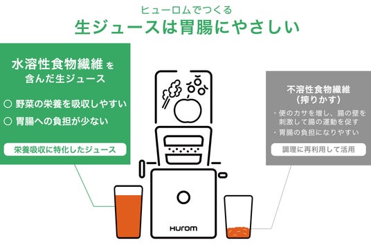 ヒューロムが提案する胃腸にやさしい生ジュース『 Hurom CARE JUICE 』は、野菜や果物をスロージューサーでゆっくりとすり潰すようにジュースにすることで、不溶性植物繊維を取り除きながら、酵素やビタミン類、ファイトケミカルなどの栄養素を壊さずにしっかりと抽出できます。もしも胃腸がお疲れ気味で消化吸収力が落ちている時もジュース(液体)の状態なら、胃腸への負担を最小限にして必要な栄養を吸収することができます。
