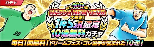 さらに、現在開催中の「最大100連!全世界配信7周年記念大感謝!北中南米選手限定1枠SSR確定10連無料ガチャ」の他、「最大100連!HAPPY NEW YEAR大感謝!1枠SSR確定10連無料ガチャ」など、SSR選手を確定で入手できる無料ガチャも多数開催されます。