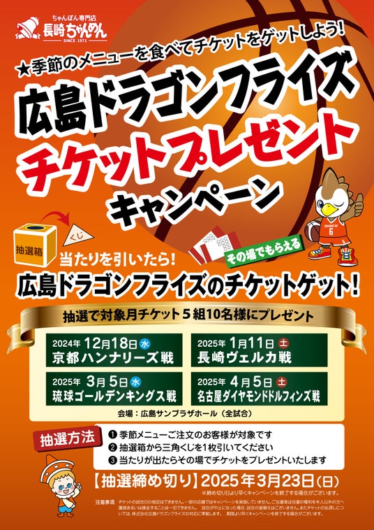 広島県内5店舗の「長崎ちゃんめん」にてプロバスケットボールチーム・広島ドラゴンフライズの試合チケットが抽選で当たるプレゼントキャンペーンを実施いたします。12月5日(木)より販売を開始いたします「季節限定メニュー」のご注文でくじ引きを店内で引いていただき当選されたお客様にその場でチケットをプレゼントいたします。対象試合はホーム開催の4試合で各試合毎に抽選期間がございます。どうぞ、旬な味覚のお食事と共にお楽しみください。皆さまのご来店をスタッフ一同お待ちしております。
