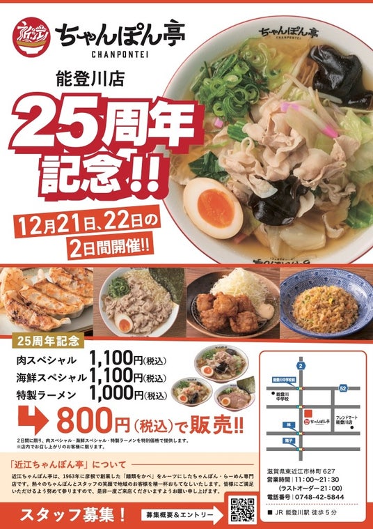 店内飲食限定 人気メニューを特別価格で提供!祝・25周年!近江ちゃんぽん亭 能登川店 感謝の2日間