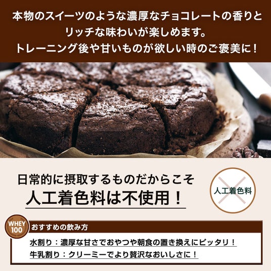 本物のスイーツのような濃厚なチョコレートの香りと、贅沢なリッチな味わいをお楽しみいただけるガトーショコラ風味のプロテイン!まるで焼きたてのガトーショコラを頬張ったときのような、深みのあるカカオの風味と甘さが広がります。