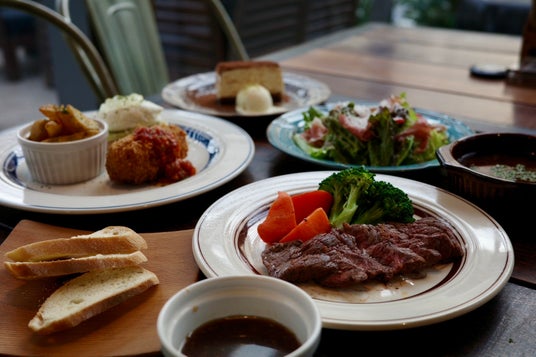 ハンバーグの付け合わせの野菜の葉や茎を使ったきんぴらや、メインメニューのステーキで使用したお肉のすじをじっくり煮込んで作った牛すじカレーなど栄養がたっぷりのヘルシーでエシカルな料理も食べ放題です。野菜の普段捨ててしまいがちな部分を活用することで食品ロスを防ぐことを心がけております。