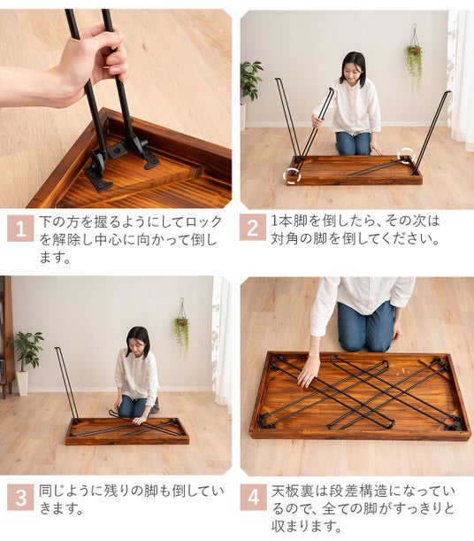 収納時にすべての脚が天板裏に収まるコンパクト設計。収納したいときにスッキリと収まる、使い勝手にこだわりました。