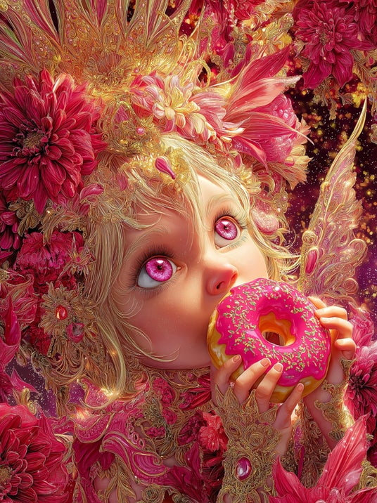 作者 根本じゅんのすけ 受賞者コメント 妖精の女の子があこがれていた人間界のおいしい食べ物「ドーナッツ」をついに口にしてしまった瞬間・・・何かが起こった・・・・という画像に画像生成の試行錯誤でたどり着きました。
