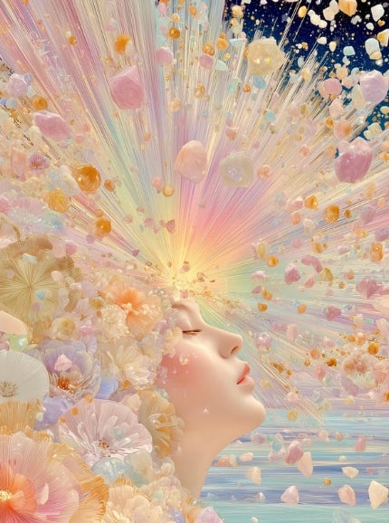 閉じた瞼の向こうで、光の粒と記憶のかけらがゆっくりと立ち上がり、