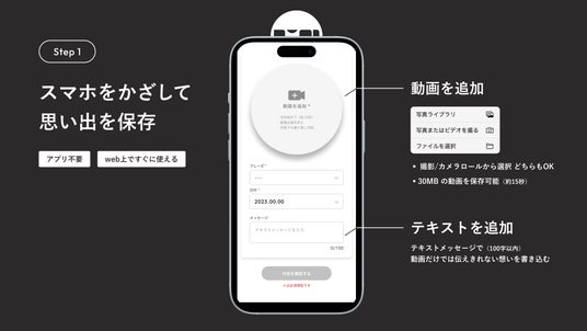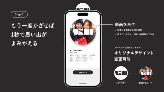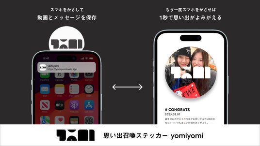 「yomiyomi」は、スマホをかざすだけで動画メッセージを保存・再生できる「思い出召喚ステッカー」です。ステッカーにはICチップが埋め込まれており、スマートフォンをかざすとブラウザが自動で起動。専用アプリは不要で、そのまま動画の撮影やメッセージの編集が行えます。