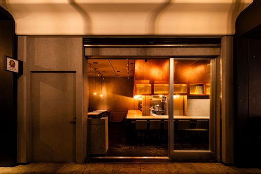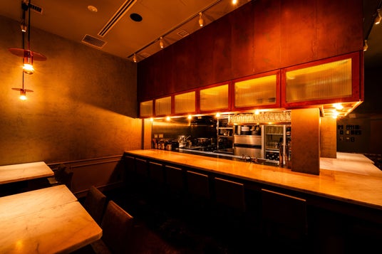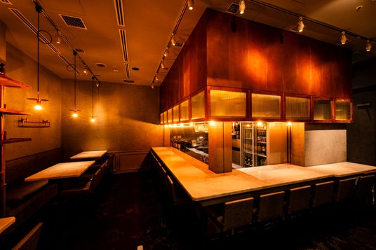大理石のテーブルをメインに、グレー、ブロンズでシックに仕上げた店舗デザイン。