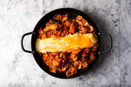 鶏肉、キャベツ、玉ねぎ、さつまいも、ピーマン、しめじ、トッポギ、ラーメン