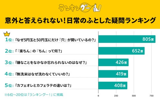 1位は805票を獲得し、「なぜ5円玉と50円玉にだけ『穴』が開いているの?」に決定!2位は「『楽ちん』の『ちん』って何?」 3位は「嫌なことをなかなか忘れられないのはなぜ?」7票差で4位は「無洗米はなぜ洗わなくていいの?」そして、5位には「カフェオレとカフェラテの違いは?」がランクインしました!