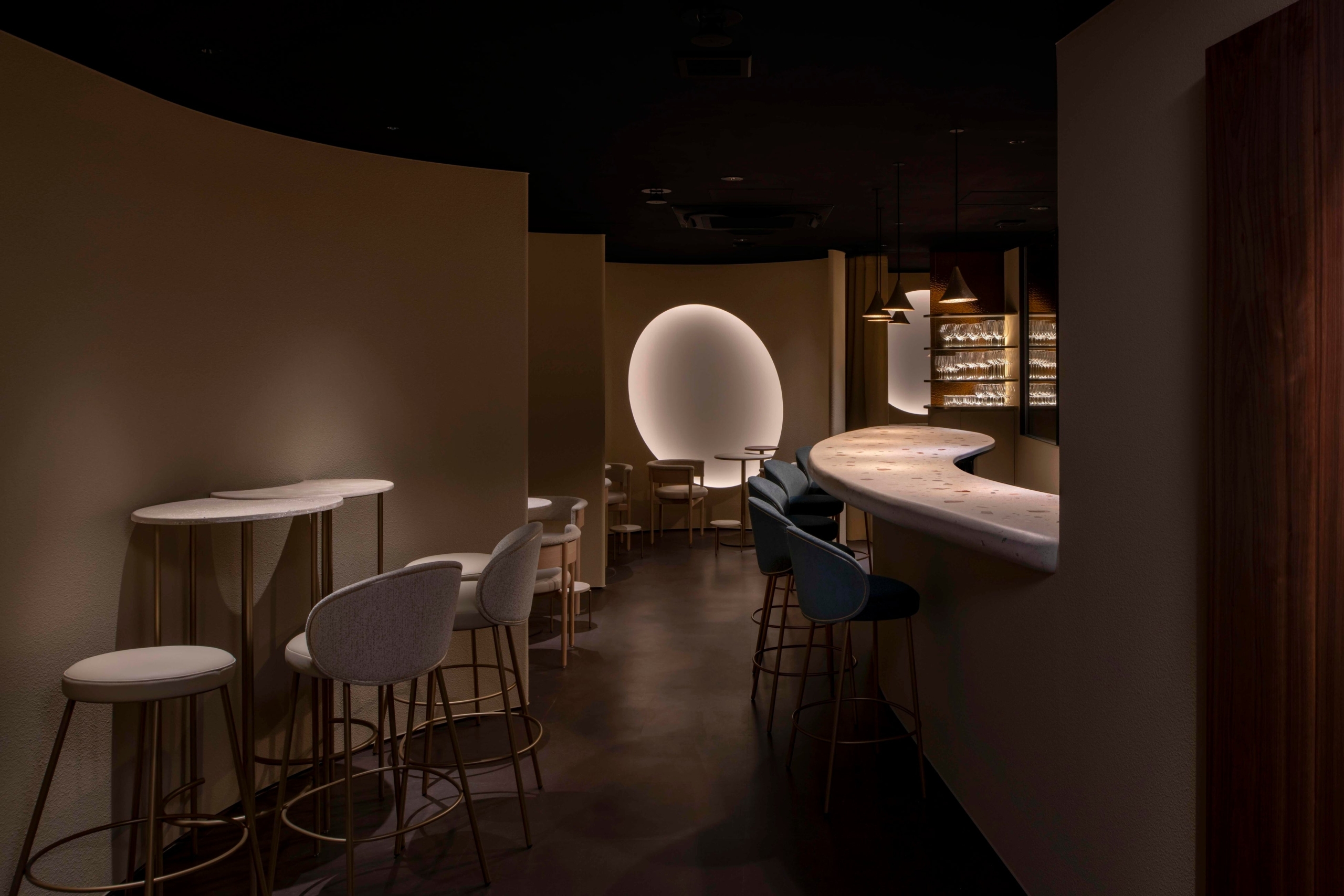 緩やかな曲線と楕円の重なりで構成されたこの空間は、コンパクトでありながら、心地よい没入感を生み出しています。シェアリングテーブル、カウンター、ラウンジ、個室--それらは明確に仕切られているわけではありません。灯りの灯し方、テーブルと椅子の形や配置、波打つように閉じているけれど開かれているような境界が、隣のエリアを気にさせることなく、それぞれの時間への集中を自然に生み出しています。