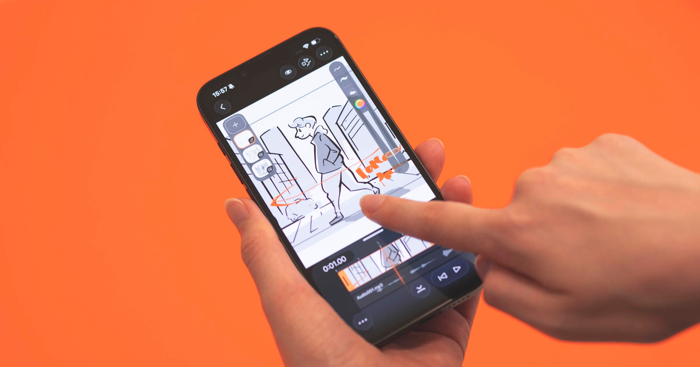これまでの機能をそのままに、指先で触れるiPhoneの細かい操作にも対応できるようになりました。ショットパネルにイラストを描くといった、タイムラインの操作も、従来のiPadでの体験に基づいた仕様にしています。