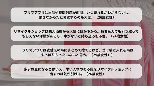20~30代の女性68名にヒアリングを行ったところ、多くの人が「もったいない」と思いつつも服を手放せず、結局は捨ててしまう理由として、こんな声がありました。