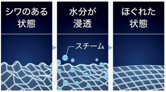 衣類のシワの原因は、絡みついたまま乾燥した繊維。衣類スチーマーで、水分を与えて「ほぐす」ことでシワをのばします。シワのばしのポイントは繊維の奥までしっかり水分を浸透させること。スチーム量が多いほど浸透効果は高まり、スチームが繊維の奥までしっかり浸透し、繊維がほぐれシワがのびやすくなります。