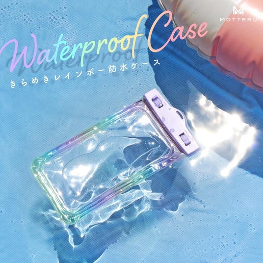 キラキラ輝くレインボーグラデーション ●レインボーのグラデーションがかわいい防水ケース(MOT-WPCGD-RA) ⇒【セール特価:1,780円(税込)】 パープルのヘッド・ネックストラップとマッチするレインボーカラーです。