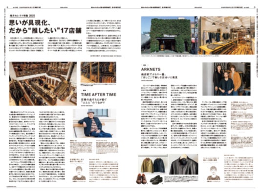 取り上げたのは、編集部の記者が推す店舗。“推し”の度合いは、「是非取材したい」から「訪れたことがある」や「ウワサを聞いている」までさまざまでしたが、記者は一律感動したり、感銘を受けたりして帰京。ますます“推す”ようになりました。圧倒的な規模感から、こだわりの商品選び、濃くて深い接客と、一方で敷居を感じさせない空間づくり、地方らしいちょっぴりスローな衣食住のライフスタイル提案など、いずれもオーナーや店長、働く人たちの思いが具現化しているからこそ、素直に共感・感動し、モノを買いたくなったり、また会いに行きたくなったりしてしまう店舗が目白押しです。福島のTIME AFTER TIME、栃木のARKNETS、群馬のBELLURIA、石川のPHAETONとMAISON DE CALNE、静岡のSELECT EYE COMPANYとSIGNAL、愛知のJURK、愛媛のCROIX、そして福岡のDICE&DICEとTRENTを紹介しています。