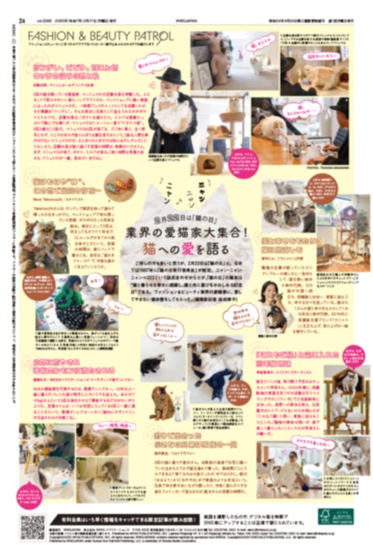 そのほかは、サバト・デ・サルノ(Sabato de Sarno)クリエイティブ・ディレクターの退任で揺れる「グッチ(GUCCI)」に関するアナリストによる分析まとめ、パリ・ファッション・ウイークに公式参加していないブランドが「パリコレ」と名乗ることに関する弁護士の見解などを掲載しています。連載では、中国の最先端AIマーケティングやビューティ業界におけるインド市場のポテンシャルなどを論じています。巻末のファッション&ビューティパトロールでは、迫る「猫の日」にちなみ、業界の猫好きに大集合していただきました。近藤広幸マッシュホールディングス社長のオフィスでくつろぐ、マシュマロ、ポテト、ミルクの3匹など、17匹の猫ちゃんが勢揃いです。
