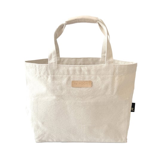 推しぬいのお部屋になるトートには「fav ROOM」のパッチ付き。毎日使えるシンプルな生成のトートで、置いたときもしっかり自立。