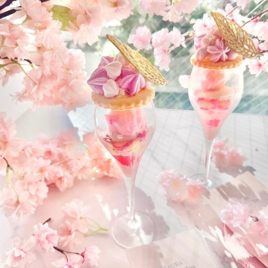 グラスの中には、苺と桜餡のクリームがしっとり絡み、カルダモンが香る苺ジュレやライチ風味の白玉が、もちもち感と爽やかさを加え、あられや苺、マカロンがそれぞれの食感を楽しませてくれます。パティシエが丁寧に仕上げたこだわり抜いた層ごとの調和が春を感じさせ一口ごとに異なる味わいが食べるたびに新たな発見を与えてくれる一品です。贅沢な春の体験をお楽しみください。