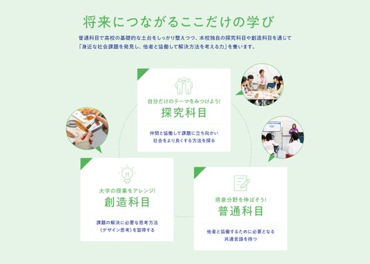 「普通科目」で高校の基礎的な土台をしっかり整えつつ、「探究科目」や本校独自の「創造科目」を通じて、社会で求められる力を養います。デザイン思考の考え方をもとに社会課題の解決方法を学び、「身近な社会課題を発見し、他者と協働して解決方法を考える」実践的なスキルを身につけられます。大学連携や独自のカリキュラムにより、他校にはない特色ある学びを提供し、将来の進路や社会での活躍につながる教育を実現しています。