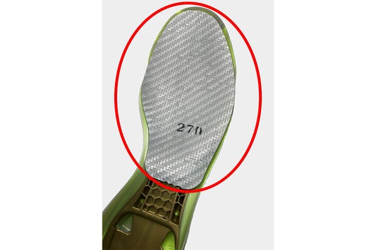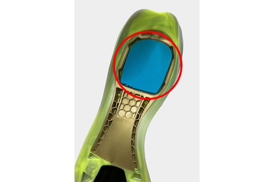 アウトソールは、『α Triangle Stud(アルファ トライアングルスタッド)』を引き続き採用し、より進行方向へのスピード、クイックな動きに注目した構造にしています(図1)。また、エネルギーロスを小さくし、全力疾走に貢献する高反発中底『KaRVO RSTM(カルヴォ)』の厚さを再設計(図2)し、反発性と柔軟性を追求しました。また、踵部分に『MIZUNO ENERZY(ミズノ エナジー)』を採用することでクッション性を追求しました(図3)。