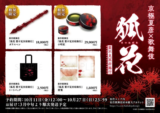 松竹株式会社は、運営する通販サイト『松竹ストア』内の歌舞伎・演劇関連グッズサイト「松竹歌舞伎屋本舗」にて、歌舞伎座「八月納涼歌舞伎」第三部で上演された新作歌舞伎『狐花 葉不見冥府路行』のオリジナルグッズを10月11日(金)12:00より予約販売開始します。