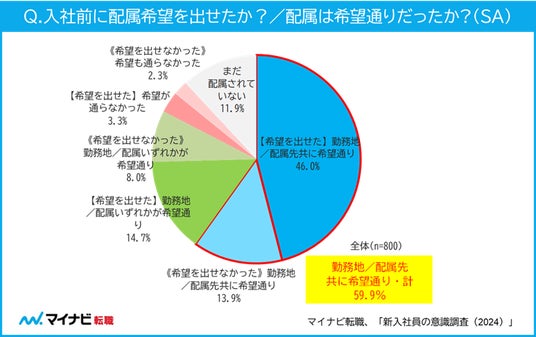 勤務地・配属先共に希望通りだった人は59.9%に留まり、半数近くの新入社員は希望とは異なる場所でファーストキャリアを歩んでいることがわかる。