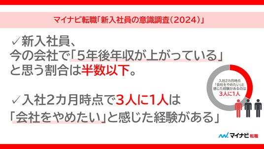 株式会社マイナビ(本社:東京都千代田区、代表取締役 社長執行役員:土屋芳明)が運営する総合転職情報サイト『マイナビ転職』(https://tenshoku.mynavi.jp/)は、2024年に新卒入社した男女(新入社員)800名を対象に行った「新入社員の意識調査(2024)」の結果を発表しました。本調査では、新入社員の給与実態や将来への不安、「配属」に対する考え方などが明らかになりました。