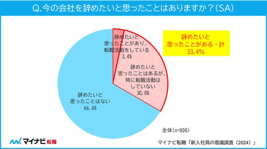 入社2カ月時点で「会社を辞めたいと思ったことがある」新入社員は33.4%。一方、そのうち転職活動をしている人は3.4%で、不満を持ちながらも勤務を続けている様子がうかがえる。
