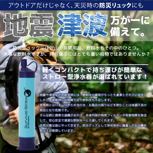 「Solo Sapiens サバイバルストロー」は、災害時に活躍する携帯浄水器です。活性炭を備えたコンパクトで高性能なアウトドア用の浄水ストローで、災害時や断水時に安全性の高い飲料水を確保できます。登山やアウトドアに加え、海外旅行でも活躍し、防災グッズとして備蓄することもオススメです。