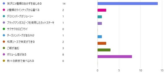 ※一部店舗では商品内容が異なる場合がございます。 ■調査結果 1位: 贅沢に3種類のおかずを愉しめる 2位: ボリューム感がある 3位: ごはんが進む