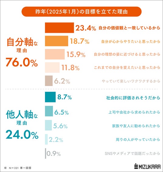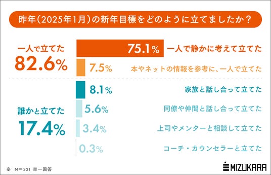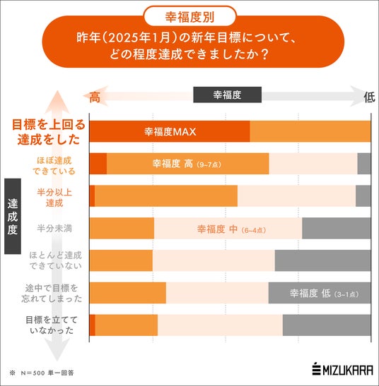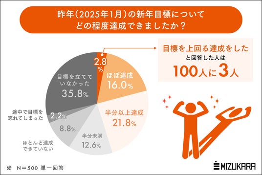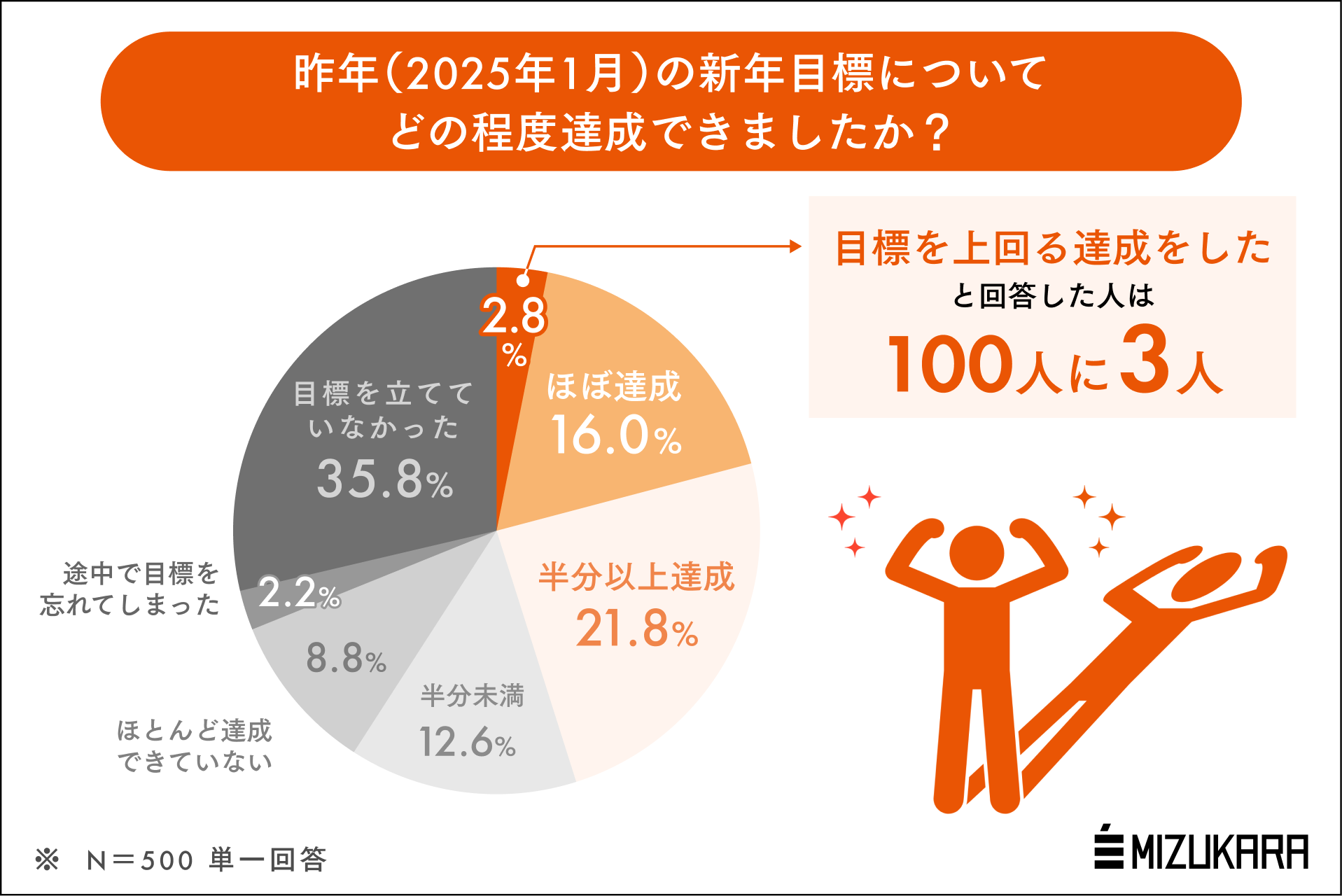 認知科学に基づくコーチングを法人・個人に提供する株式会社ミズカラ(本社:東京都千代田区、代表取締役 山宮健太朗)は、2025年12月12日(金)に20歳~59歳の有職男女500名を対象とした「新年の誓いの達成率」調査を行いました。