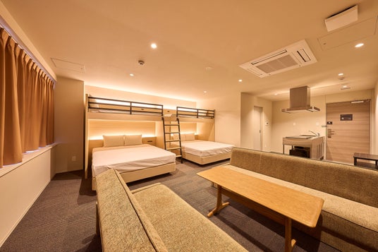 グループ個室は複数名でリーズナブルに宿泊が可能な部屋タイプです。ホテル個室は室内に専用のシャワールーム・洗面台・トイレが付いており、お子様連れに最適な布団スタイルのお部屋もございます。また、2世帯での利用も可能な8名部屋にはアイランドキッチンを配置し、コンドミニアムとして長期滞在にもご活用いただけます。