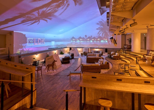 もともとはスポーツクラブのプールがあった4階は、吹き抜けならではの開放感を活かしリゾート感あふれる「ビーチラウンジ」として生まれ変わりました。ゲストが自由にくつろげるビーチチェアの周辺には白砂を敷き、まるで海辺にいるかのような、心と身体を解きほぐす穏やかな空間を演出。夕方以降にはリゾート気分をさらに盛り上げるプロジェクションマッピングが空間全体を彩り、ゲストは都心にいながら非日常のひとときを過ごすことができます。