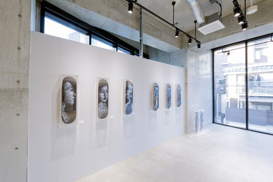 1階はペインティング原画、2階にはドローイング原画やスケートデッキ作品を展示販売。重ねて描かれた曲線が発する熱量と躍動感を体感いただけます。